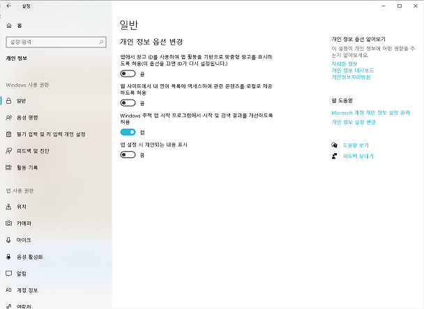 윈도우 모양 우클릭 톱니바퀴 개인> 작업 기록> 기록 저장 해제 지우기