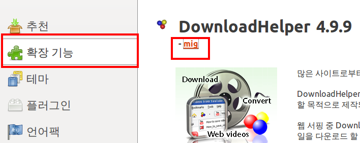 DownloadHelper 인대 여기서 확장 기능 클릭 하면 mig라고 해서 상단에 있네요..