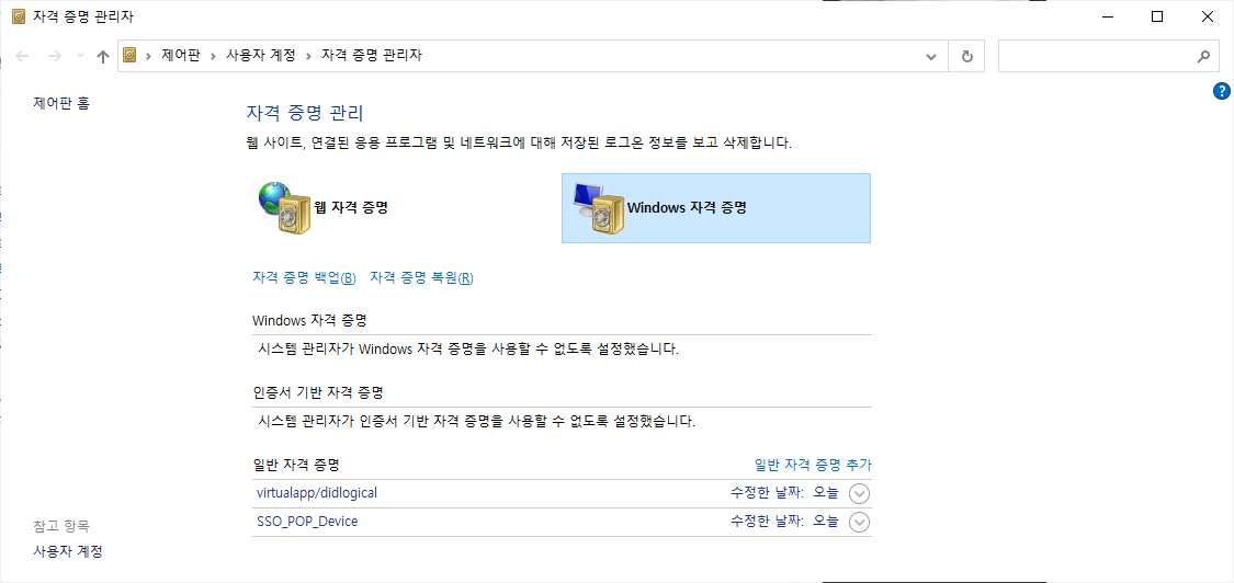자격 증명을 삭제 하니 크롬의 로그인이 삭제 되었다. 크롬 구글 로그인과 관계가 있어서 자꾸 생성 되는 것 같다. 결론.
