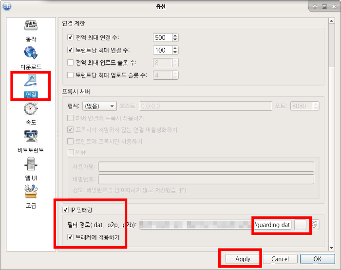 옵션> 다운로드>IP 필터 체크 파일은 dat로 인식 하네요. 확장자 변경 방법을 검색 해보세요. 파일. 쩜 이름만 변경 하면 되네요.