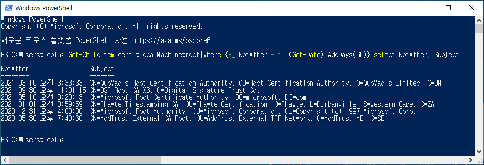 Get-ChildItem cert:\LocalMachine\root|Where {$_.NotAfter -lt (Get-Date).AddDays(60)}|select NotAfter, Subject