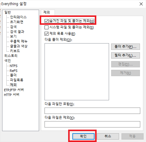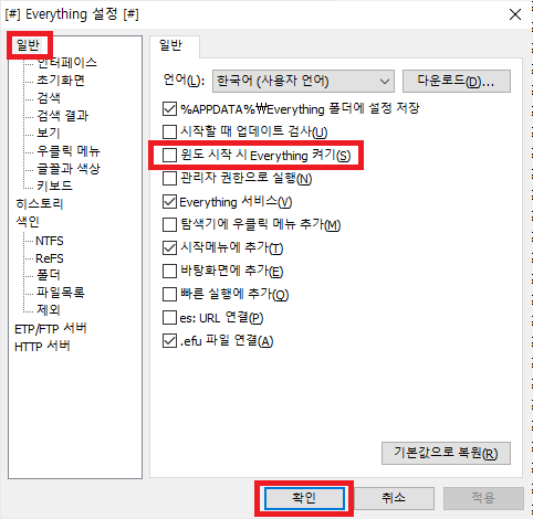 일반> 윈도우 시작 시 Everything 켜기 체크 해제