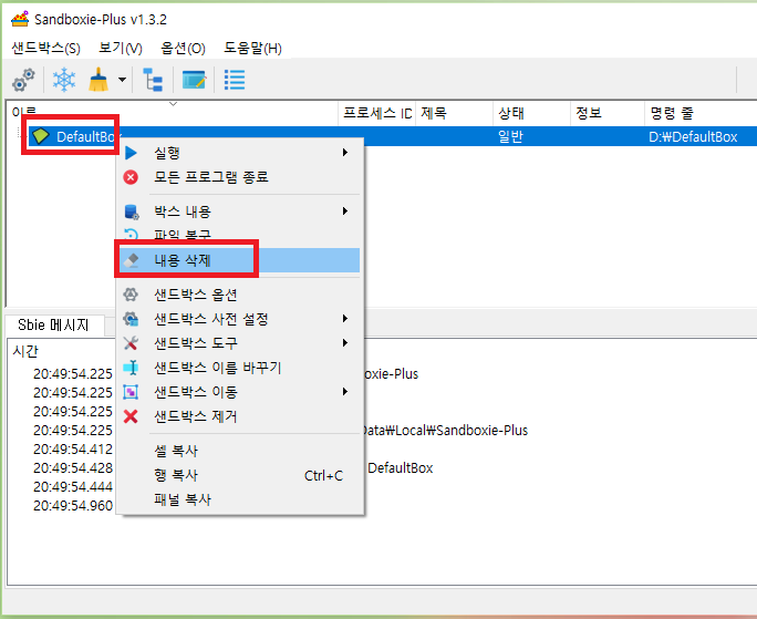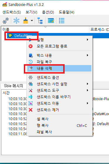 바탕 화면 샌드박스 아이콘이 삭제 되어 있어야 한다.