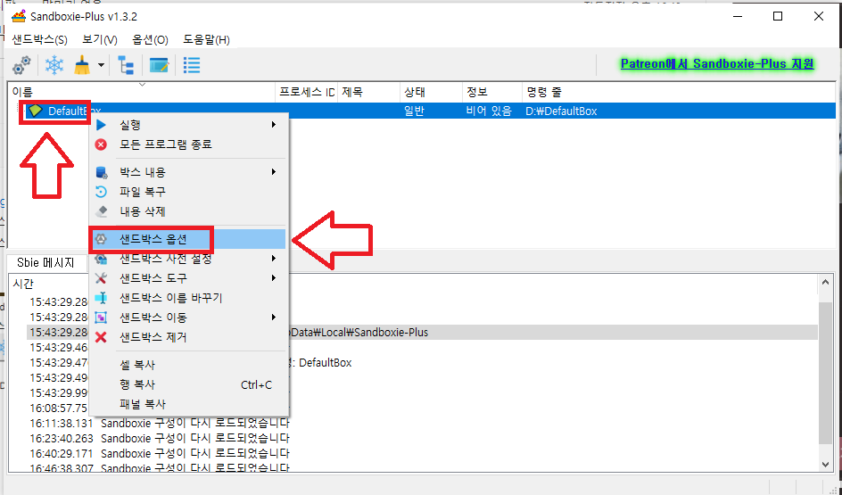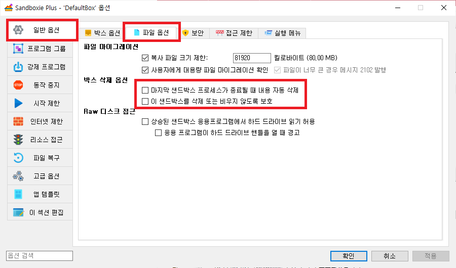 일반 옵션> 파일 옵션> 박스 삭제 옵션에서 모두 해제 해주셔야 하네요. 만약 이게 체크 되어 있으면 샌드박스가 끝나면 모두 삭제 하니 파일이 남아 있지 않게 되네요 오늘 목적은 저장이니 기본값으로 체크 되어 있지 않네요.