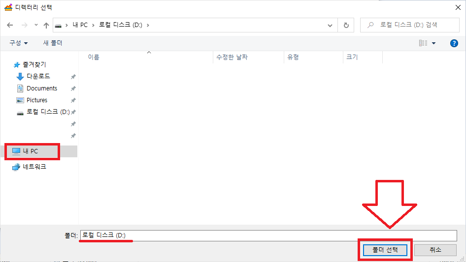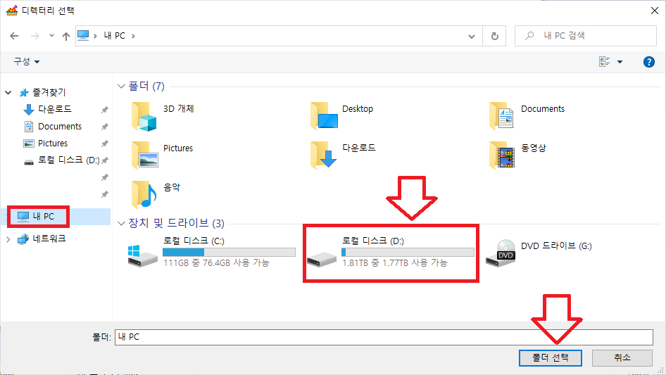 내 pc를 골라 주세요 그리고 D 드라이브. 하드가 싸고 넉넉 하니 하드를 선택 해주세요.