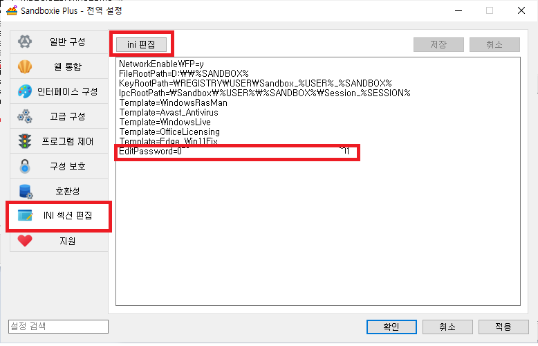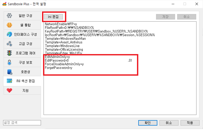 INI 섹션 편집> ini 편집 을 눌러서 아래 생긴