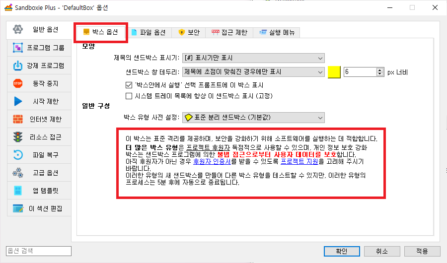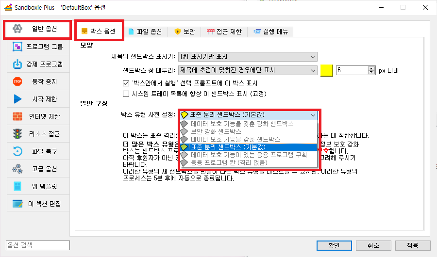 샌드박스 옵션