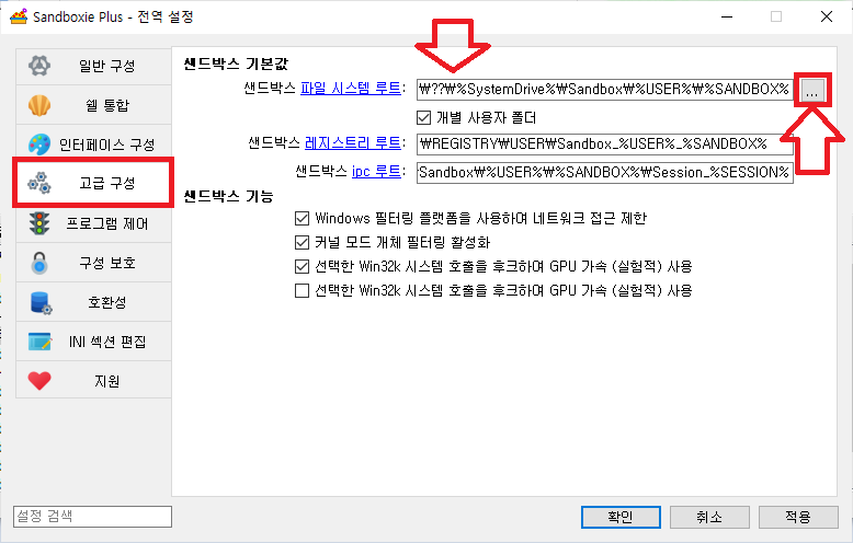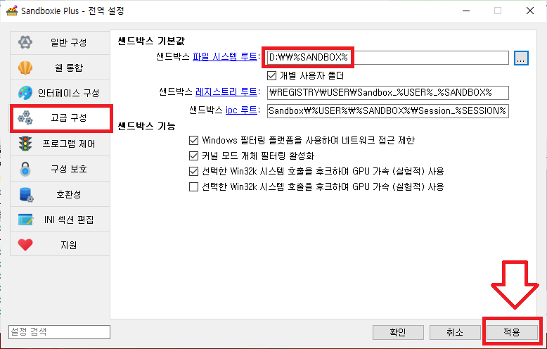 고급 구성> 샌드박스 파일 시스템 루트 ... 클릭 해서 자신이 원하는 위치 클릭 해주세요 저의 경우 D 드라이브가 넉넉 하기 때문에 D를 골라 주었네요.