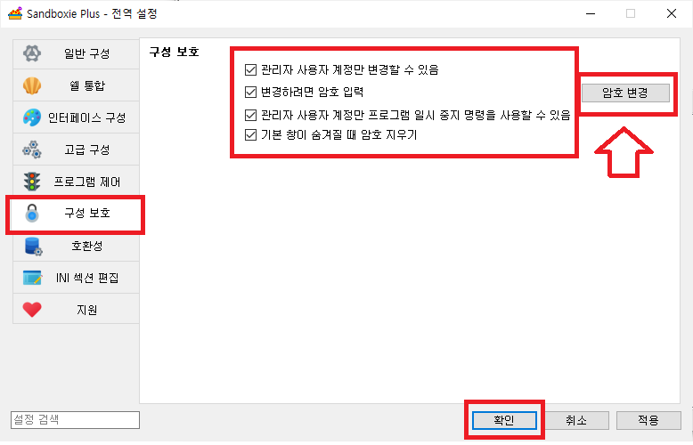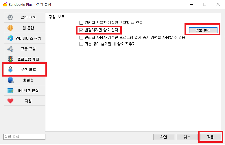 구성 보호> 변경하려면 암호 입력 > 암호 변경