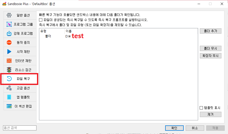 파일 복구> D:\test 폴더가 있다고 가정 하고 저도 자세히는 모르지만 샌드박스를 켜고 인지 할수 있는 폴더 같아요.