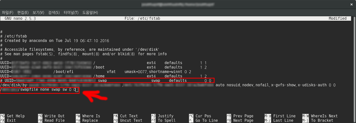 그리고 기존 swap 부분에 앞 부분에는 # 주석 쳐리 해주세요 오류가 날수 있으니 말이죠.