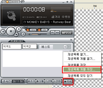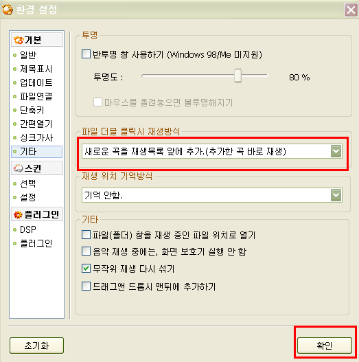 (기본값:예전에 목록 만들어 놓은 곡들이 다 지워지고 클릭 한 곡이 대신 자리를 찾이 한다 -_-;; 다시 켜도 동일 증상..)