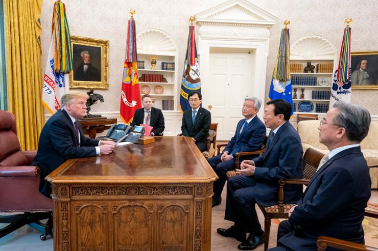 신회장과 정회장은 모두 2019년 6월 한국에서 열린 트럼프 대통령과의 회담에 참석한 한국 재계 거물들 중 한 명이다. 삼성, 현대 자동차, SK, 한화, GS, CJ, 두산의 회장들도 이 회의에 참석했다.