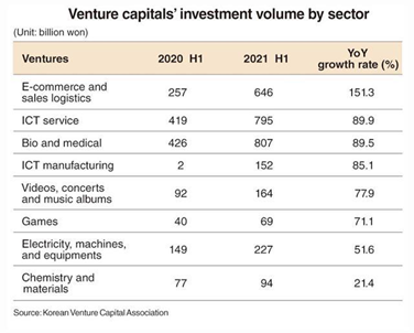 ICT services companies in 5G, artificial intelligence, big data and software development saw the second-steepest hike of an 89.9 percent increase in capital flow. Alongside growing interest in COVID-19 vaccines or biosimilars of pharmaceutical giants, bio and medical ventures saw 807 billion won of fresh investments coming in the first half.