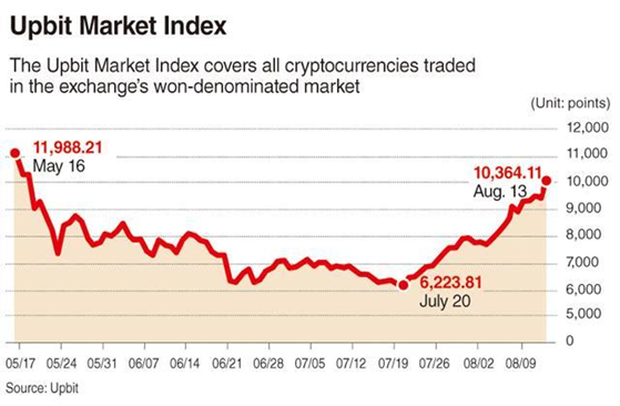 원화표시의 모든 가상화폐 거래를 추적하는 넓은 범위의 업비트 마켓지수는 한국의 가상화폐 최대시장인 업비트에 의하면 지난 금요일까지 지난 3개월동안 초기의 손실을 지난 수주일동안 회복했 음에도14%가 감소했다.
