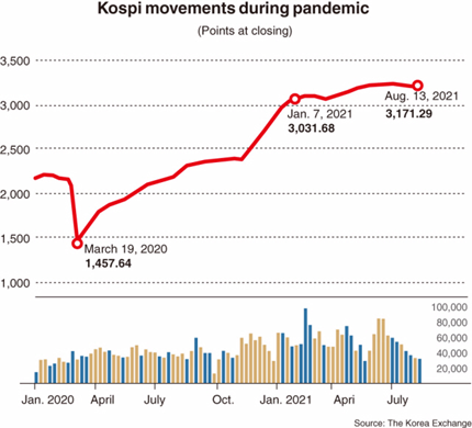 When the country’s main bourse and secondary index both hit their lowest points in nearly 11 years in March last year, with the Kospi closing at 1,457.64 points and Kosdaq closing at 428.35 points as the pandemic crashed the market, no one would have predicted the monthslong upward movement.