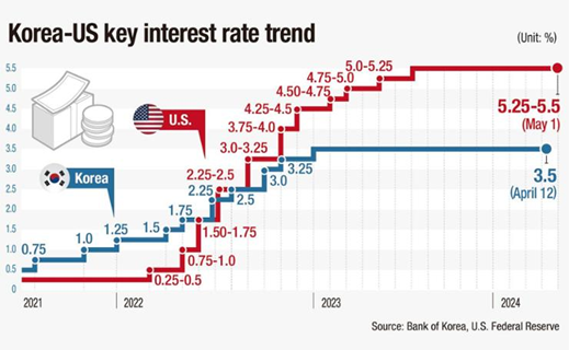 The much-anticipated monetary easing by the Bank of Korea (BOK) is expected to stall, complicated by the higher-for-longer path of the U.S. Federal Reserve (Fed), plunging Korean currency against the U.S. dollar, slowing disinflation and unmuted growth of household debt, market watchers said Thursday.