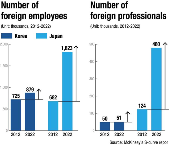 같은 기간 일본은 산업 활성화 전략 등 해외 채용 정책에 힘입어 전문 외국인 인력이 4배 가까이 증가했다.