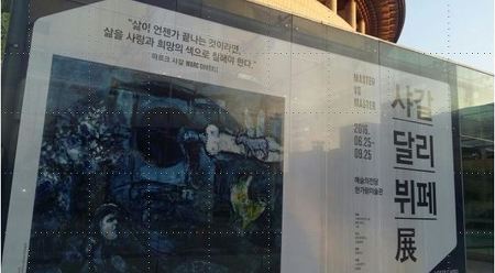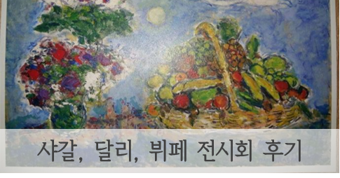 먼저 전시는 제목처럼 샤갈,달리,뷔페 3인의 다양한 작품과 연보, 그들의 생각을 엿볼수 있는 생존시 어록,동영상, 그들의 뮤즈인 연인들에 대한 정보로 구며져 있었답니다. 하지만 전시회의 사진을 찍을 수 없어 아쉬웠습니다. 마치 녹아버린 쇠처럼 축쳐진 시계그림으로 유명한 달리, 화려한 색채속에 공중에 붕 뜬 신랑신부의 그림이 떠오르는 마르크 샤갈, 거칠고 투박한 선으로 이루어진 그림이 떠오는 뷔페.. 128점이나 되는 20세기 거장 3인의 작품을 보러갔습니다.