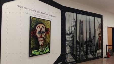 전시된 그의 작품중 가장 인상적인 작품이었습니다. <광대>는 꾸준히 그린 그의 대표적 소재. 그를 광대를 '자유로움'으로 생각해서 자유롭고자 스스로 광대로 분장하거나 자신을 광대에 대입시켜 그렸다고 하네요. 뷔페의 광대그림은 많은 사랑을 받았고 그의 대표작이 되었습니다. (거칠고 강렬한 선으로 표현된 그림속 광대의 얼굴을 들여다보고 있으면 우울하고 불안한 현대인의 자화상같다는 생각이 들었습니다.) 그외 전시된 뷔페의 작품중 <로슈포트 근교>는 무채색의 차가운 작품이 대부분인 그의 작품중 연두,초록,노랑색을 써서 따뜻한 느낌이 드는 아름다운 풍경화로 기억에 남았습니다. 작품 <꽃이 있는 정물화>도 밝고 인상적인 작품이었답니다.