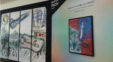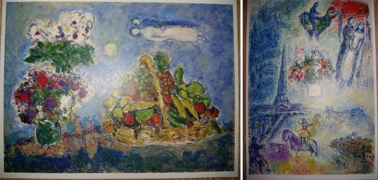 하늘을 나는 듯한 신랑,신부, 꽃과 동물들이 화려한 색채로 환상적인 배경속에 그려진 샤갈의 작품들입니다. 러시아의 유태인가정 출신인 샤갈은 1,2차 세계대전을 겪으며 프랑스로 망명했다고 합니다. 그래서 늘 고향을 그리워했던 샤갈은 그의 고향의 풍경들,동물들을 그림속에 등장시킵니다. 유독 떠있는 연인이나 신랑신부가 그림에 많이 등장하는 것은 고향,가족,연인등 인간적 유대를 중요시했던 샤갈의 화두였습니다. 샤갈은 회화뿐만 아니라 판화, 도자기,스테인드 글라스,무대연출,벽화 등 다양한 분야에 정통했다고 합니다.