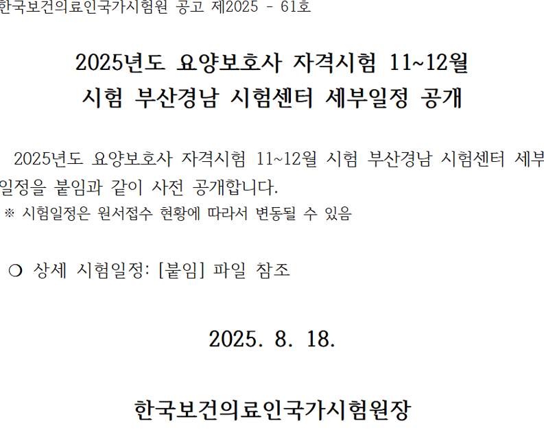 국시원_[시험] 2025년도 요양보호사 자격시험 11~12월 시험 부산경남 시험센터 세부일정 공개 작성자아름다운 그녀(서울)|작성시간25.08.19|조회수130 목록 댓글 0 글자크기 작게가 글자크기 크게가 붙임. 2025년도 요양보호사 자격시험 11~12월 시험 부상경남 시험센터 세부일정 공개.hwp82.50KB 첨부파일첨부된 파일이 2개 있습니다. etc 파일 u8EDDORYASKQKvyRJa38mYLwkIF8ToVsmVT8Xx7bQIxxiDK7xZuXQ5AsI0GYkhAjhyVUKJEDjg48DNNlFEMGUREREREZFWvVqdIRERERESUCoYMIiIiIiKyKoYMIiIiIiKyKoYMIiIiIiKyKoYMIiIiIiKyKoYMIiIiIiKyKoYMIiIiIiKyKoYMIiIiIiKyKoYMIiIiIiKyKoYMIiIiIiKyKoYMIiIiIiKyKoYMIiIiIiKyKoYMIiIiIiKyKoYMIiIiIiKyKoYMIiIiIiKyKoYMIiIiIiKyKoYMIiIiIiKyKoYMIiIiIiKyKoYMIiIiIiKyKoYMIiIiIiKyKoYMIiIiIiKyKoYMIiIiIiKyKoYMIiIiIiKyKoYMIiIiIiKyKoYMIiIiIiKyKoYMIiIiIiKyKoYMIiIiIiKyKoYMIiIiIiKyqv8BC5foiJN+EtsAAAAASUVORK5CYII= 다운로드 hwp 파일 붙임. 2025년도 요양보호사 자격시험 11~12월 시험 부상경남 시험센터 세부일정 공개.hwp 다운로드 다음검색 현재 게시글 추가 기능 열기 북마크 공유하기 신고 센터로 신고 댓글 댓글 0 댓글쓰기 답글쓰기 댓글 리스트