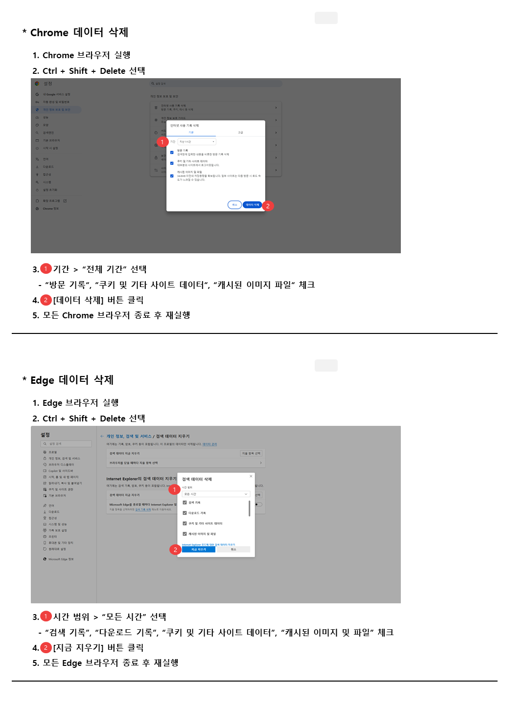노인장기요양보험 홈페이지 개편 이후 화면 비정상 출력 시 조치사항 안내 작성자아름다운 그녀(서울)|작성시간26.01.19|조회수111 목록 댓글 0 글자크기 작게가 글자크기 크게가 노인장기요양보험 홈페이지 개편 이후 화면이 일부 비정상적으로 보이는 경우 아래와 같은 방법으로 브라우저 임시파일 삭제 후 재접속 하여 주시기 바랍니다. 감사합니다. 다음검색 현재 게시글 추가 기능 열기 북마크 공유하기 신고 센터로 신고 댓글 댓글 0 댓글쓰기 답글쓰기 댓글 리스트