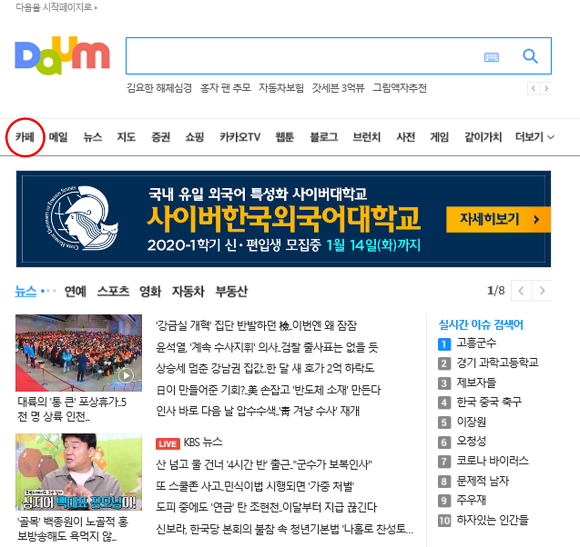 1) DAUM 사이트를 로그인 하신 후 메인화면에서 '까페' 메뉴 버튼을 클릭합니다.