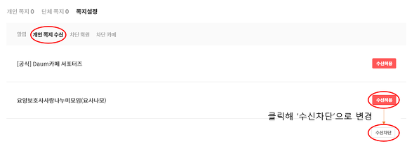 4)'개인 쪽지 수신'을 클릭 후 해당 까페의 개인 쪽지 수신허용을 '수신차단'으로 변경합니다.