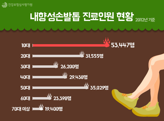 건강보험심사평가원의 통계자료에 따르면 내향성손발톱 진료인원은 2009년 195,386명에서 2012년 230,896명으로 지난 4년간 35,510명이 증가했는데요. 2012년도 진료인원을 연령별대로 분석하면 10대가 23.1%를 차지하며 가장 높았고 또한, 지난 4년 동안 계속 가장 많은 점유율을 기록하고 있었습니다.