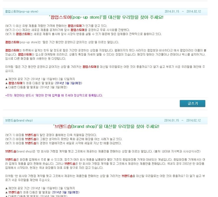 올해 처음으로 다듬을 말은 메디텔(meditel), 팝업스토어(pop-up store), 브랜드숍(brand shop), 드러그스토어(drugstore) 인데요. 공모기간은 1월15일부터 2월12일까지였습니다. 이번 기회를 놓치신 분은 다음 기회를 꼭 노리시길 바랍니다. 폴리씨도 도전할 생각이랍니다.^^