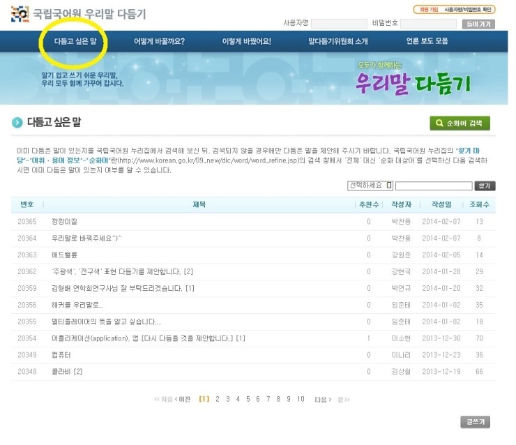 다듬고 싶은 단어가 혹시 이미 다듬은 말이 있는지 먼저 살펴보셔야 해요. 국립국어원 누리집에서 검색하신 뒤, 검색되지 않을 경우에 게시판 글쓰기를 통해 제안하면 됩니다. 그 다음 ‘어떻게 바뀔까요?’를 클릭하면 다음과 같은 화면을 볼 수 있는데요.