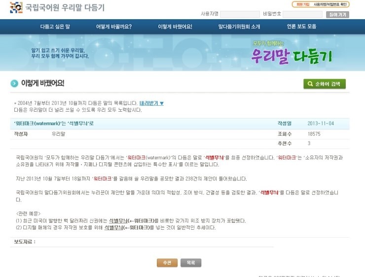 지난해 10월 7일부터 18일까지 ‘워터마크’를 대신해서 쓸 우리말을 공모한 결과 238건의 제안이 들어왔고, 국립국어원의 말다듬기위원회에서는 누리꾼이 제안한 말들 가운데 의미의 적합성, 조어 방식, 간결성 등을 검토한 결과, ‘식별무늬’를 다듬은 말로 선정했어요.