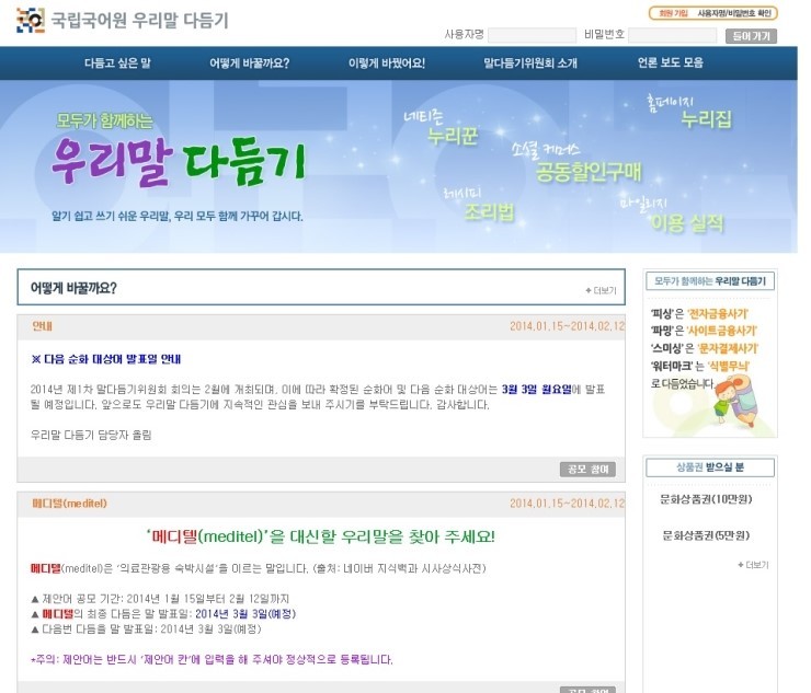 ‘다듬고 싶은 말’은 게시판을 통해 선정된 '다듬을 말'(순화 대상어)을 대신할 쉽고 아름다운 우리말을 제안하는 공간입니다. 한 분당 세 개까지 제안할 수 있는데요. 국립국어원에서 확정한 다듬은 말(순화어)을 공모 기간에 제안하신 분에겐 문화 상품권을 드립니다~!