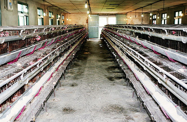 철제 케이스 크기는 가로 30cm, 세로 15cm이고요, 이 사각 면적의 철제 케이스에서 암탉 한 마리는 계란을 낳는 기계가 됩니다.