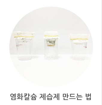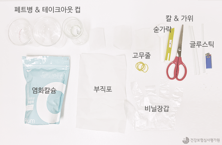 준비물 : 염화칼슘, 빈 페트병 혹은 테이크아웃 컵, 칼, 가위, 한지(혹은 부직포), 테이프, 고무줄, 비닐장갑