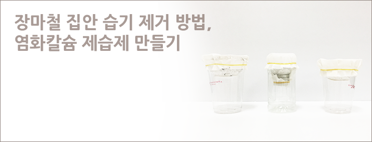 염화칼슘은 인터넷으로 필요한 양을 구입하시면 됩니다. 만든 제습제는 수증기가 공기보다 무겁기 때문에 바닥 쪽에 놓는 것이 좋습니다.
