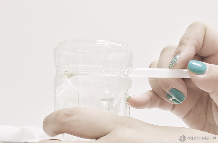 4. 염화칼슘이 손에 닿지 않도록 비닐장갑을 끼고 윗부분에 염화칼슘을 80% 정도 채웁니다.