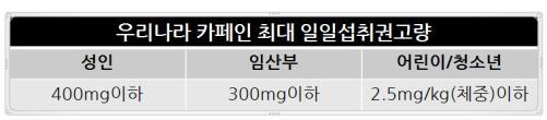 카페인 1일 권장섭취량은 성인 400mg 이하, 임산부 300mg 이하, 어린이 및 청소년 체중 1kg 당 2.5mg 이하이기 때문이죠!