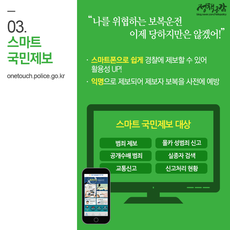 보복운전, 묻지마 폭행 등을 스마트폰으로 바로 제보, 신고 할 수 있는 스마트 국민제보 앱. 스마트폰으로 쉽게 경찰에게 사건을 제보할 수 있고, 익명으로 제보가 되니 제보자가 안심하고 내가 당하거나 주변 시민들이 겪은 억울함을 손쉽고 발빠르게 제보할 수 있어요.