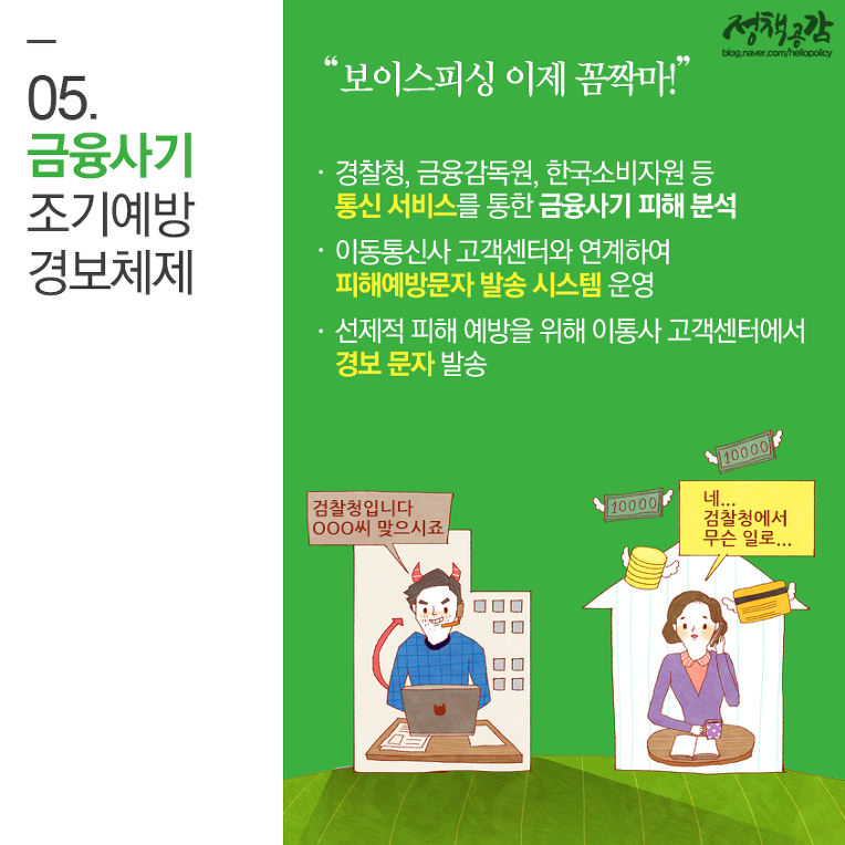 마지막으로 금융사기 조기예방 경보체제를 소개해 드릴게요. 보스이스피싱으로 인한 피해가 끊이지 않고 있는데요, 정부는 이동통신사와 협력해 피해예방문자 발송 시스템을 구축하고 운영하고 있어요. 선제적으로 피해 예방을 위해서 각 이동통신사 고객센터의 번호로 경보 문자가 발송이 돼요.