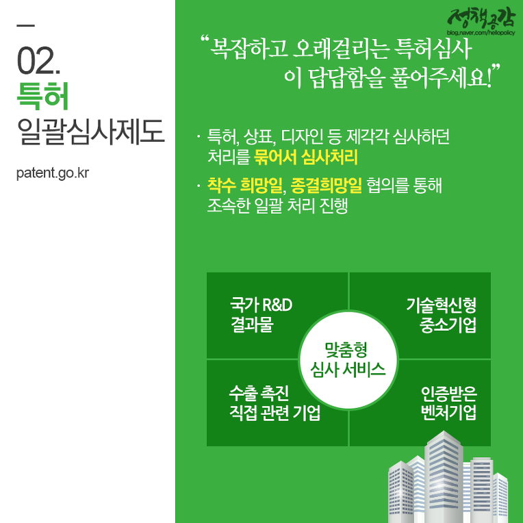 국가 R&D 분야, 기술혁신형 중소기업, 수출 촉진 직접관련 기업, 인증받은 벤처기업의 특허라면 맞춤형 심사 서비스를 통해 일괄심사를 받을 수 있답니다. 착수 희망일부터 종결희망일까지 협의가 가능하고, 상표와 디자인, 특허 관련해서 제각각 심사하던 처리를 한번에 묶어서 심사를 하니 사업하시는 분들에겐 희소식이 아닐 수 없습니다.