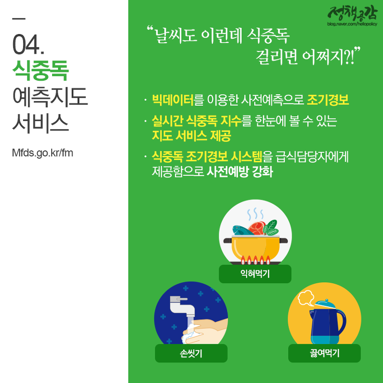 식중독 예측지도 서비스도 있어요. 빅데이터를 이용한 사전예측으로 식중독에 걸리지 않도록 조기경보 및 실시간 식중독 지수를 제공하고 있어요. 급식담당자 및 필요한 분들은 식중독 예측지도 서비스를 이용해 건강한 음식을 조리할 수 있어요.