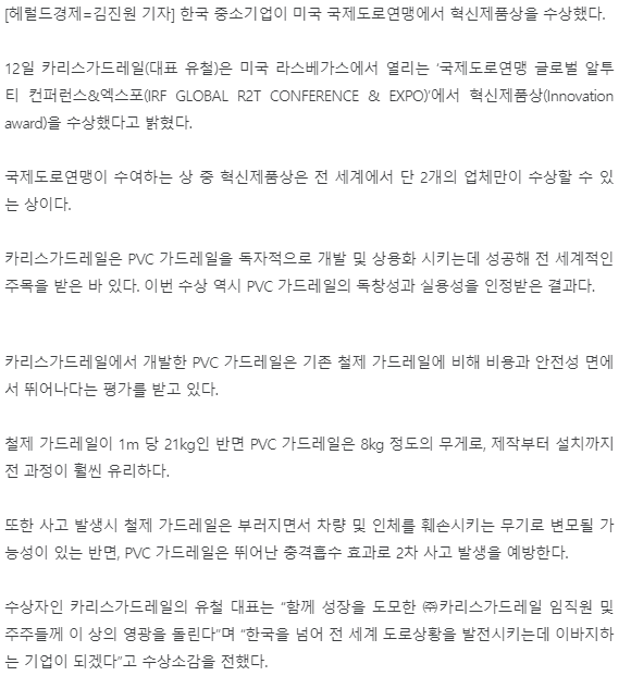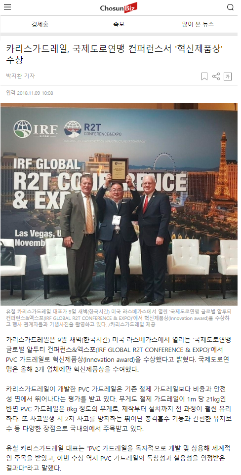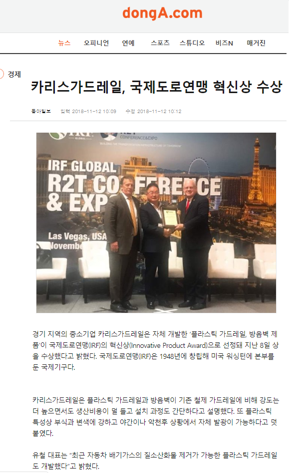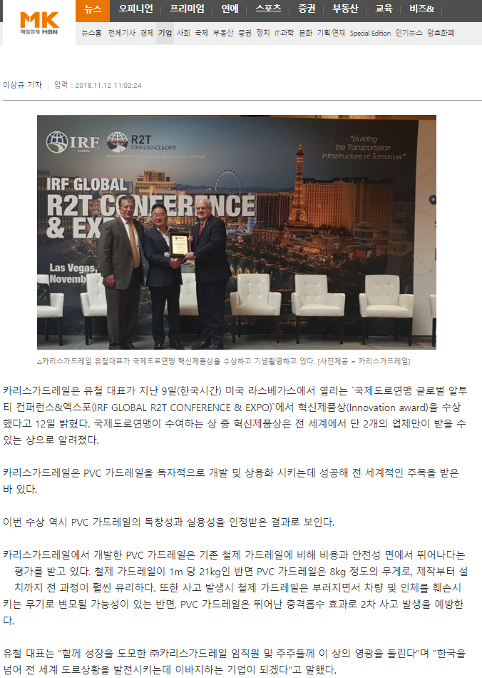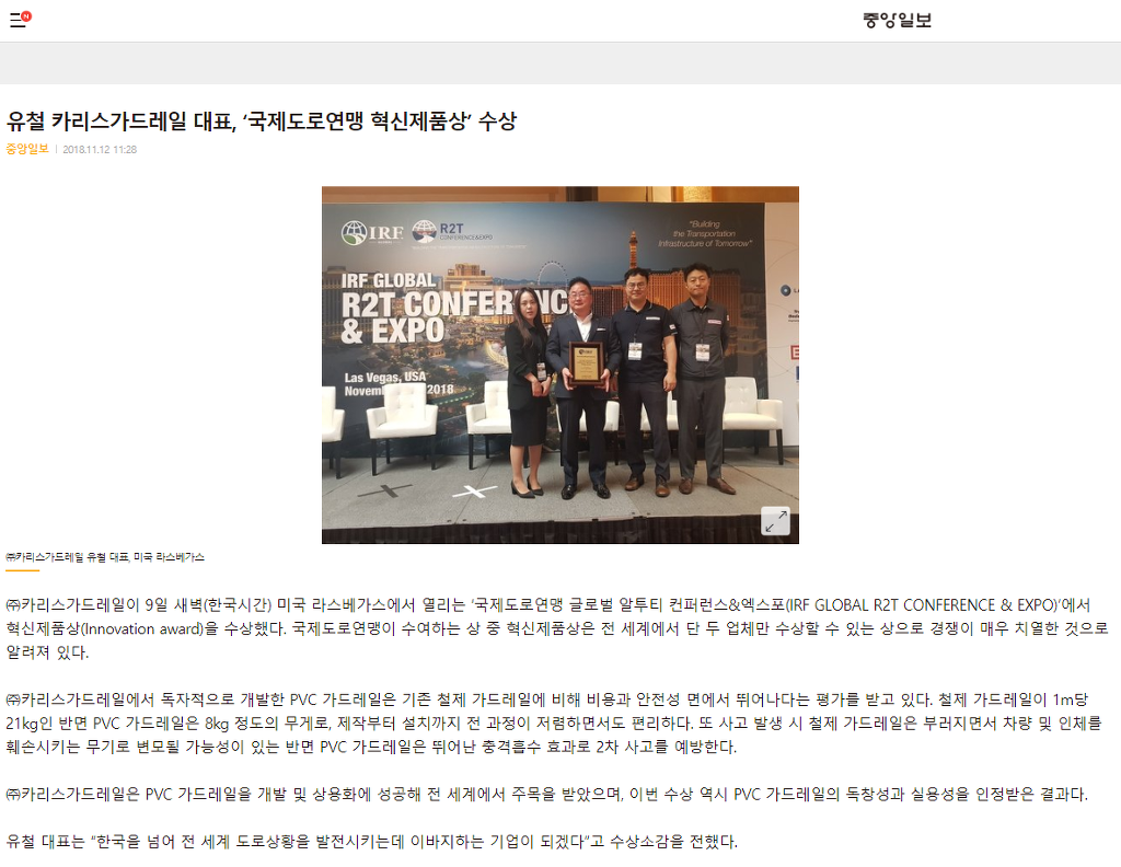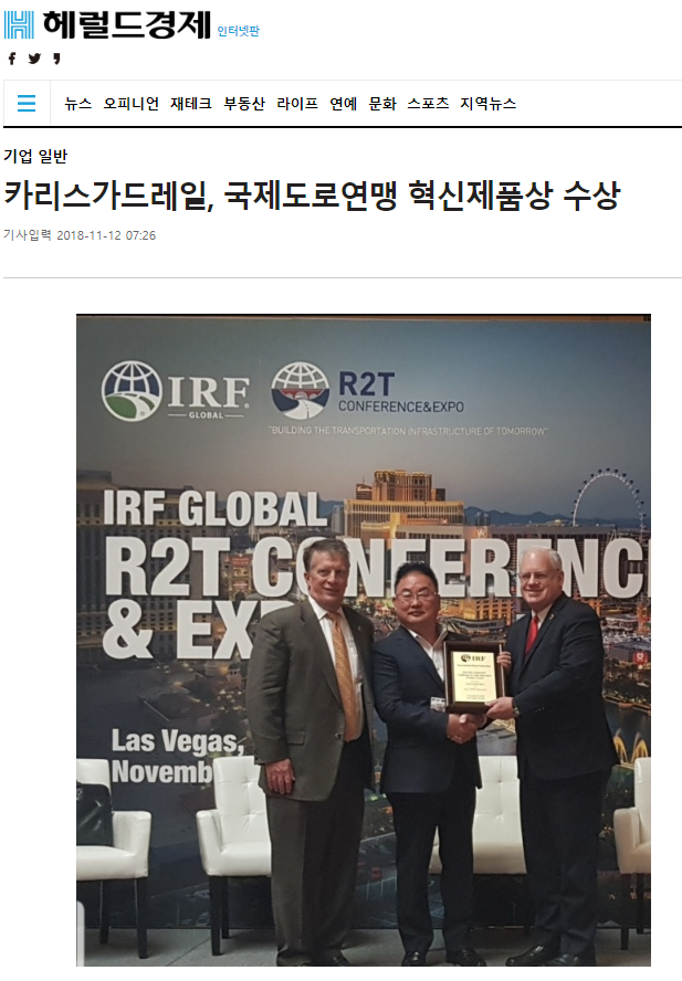 이번 라스베이거스에서 주최된 IRF(국제도로연맹) 총회에서 혁신상(이노베이션상)을 수상하였던 바에 대하여 국내 메이저 언론사에 조선일보, 동아일보, 중앙일보, 매일경제, 헤널드경제 외 약 10 건에 미디어 사이트에 보도 되었습니다. 인터넷에 카리스가드레일을