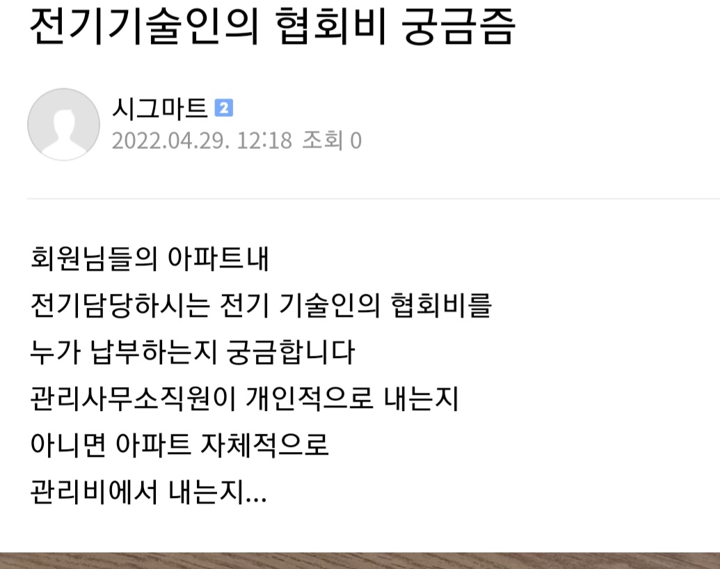 작성자도끼 작성시간 22.04.29 위 사진중 한국전기기술인협회가 각 업체장에게 보낸 공문은 근거도 없는 무식한 공문 내용입니다. 협회란 것은 동종업자간의 권익을 도모하기 위한 단체이지 아파트 관리의 상급기관이 아닙니다. 마치 협회비를 해당기관에서 납부하여야 할 것인양 저런식으로 공문을 보내는 것은 어불성설입니다. 또한 원칙적으로 관리소장이나 전기관련 자격자의 협회비는 해당 개인이 납부하는 것이 맞습니다.