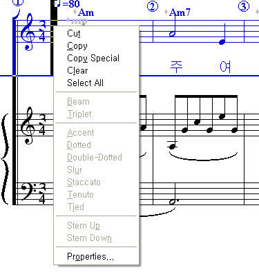 ♩=80 앞에 회색 다이아몬드를 영역 지정하고 마우스 우측 버튼을 클릭하고 나서