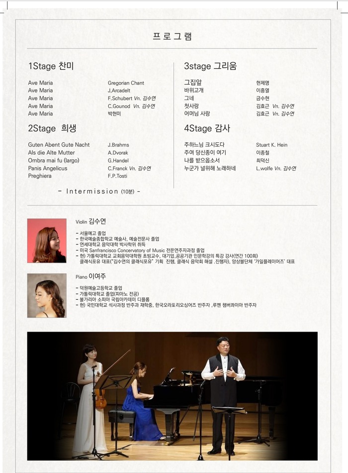 귀국후에는 바흐 솔리스텐서울의 베이스 객원 독창자로 활동하면서 바쁜 일정 중에서도 고음악전문 성악가로 활동하고 있다. 이번 독창회에서는 “어머니께 드리는 노래” 라는 주제를 가지고 찬미, 희생, 그림움, 감사의 네 파트로 나누어 어머니께 향한 감사의 마음을 노래한다.