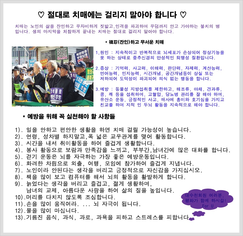 ♣절대로 치매에 걸리지 맙시다! 작성자For U|작성시간14.01.21|조회수49 목록 댓글 2 글자크기 작게가 글자크기 크게가 다음검색 현재 게시글 추가 기능 열기 북마크 공유하기 신고 센터로 신고 댓글 댓글 2 댓글쓰기 답글쓰기 댓글 리스트 작성자막달레나 | 작성시간 14.01.22 오우...정말 좋은 자료를 올려주셨네요..감사드려요...보고 늘 실천해야겠어요.. 작성자윤스테파노 | 작성시간 14.03.23 존 정보입니다. 감사합니다^^ 댓글 전체보기