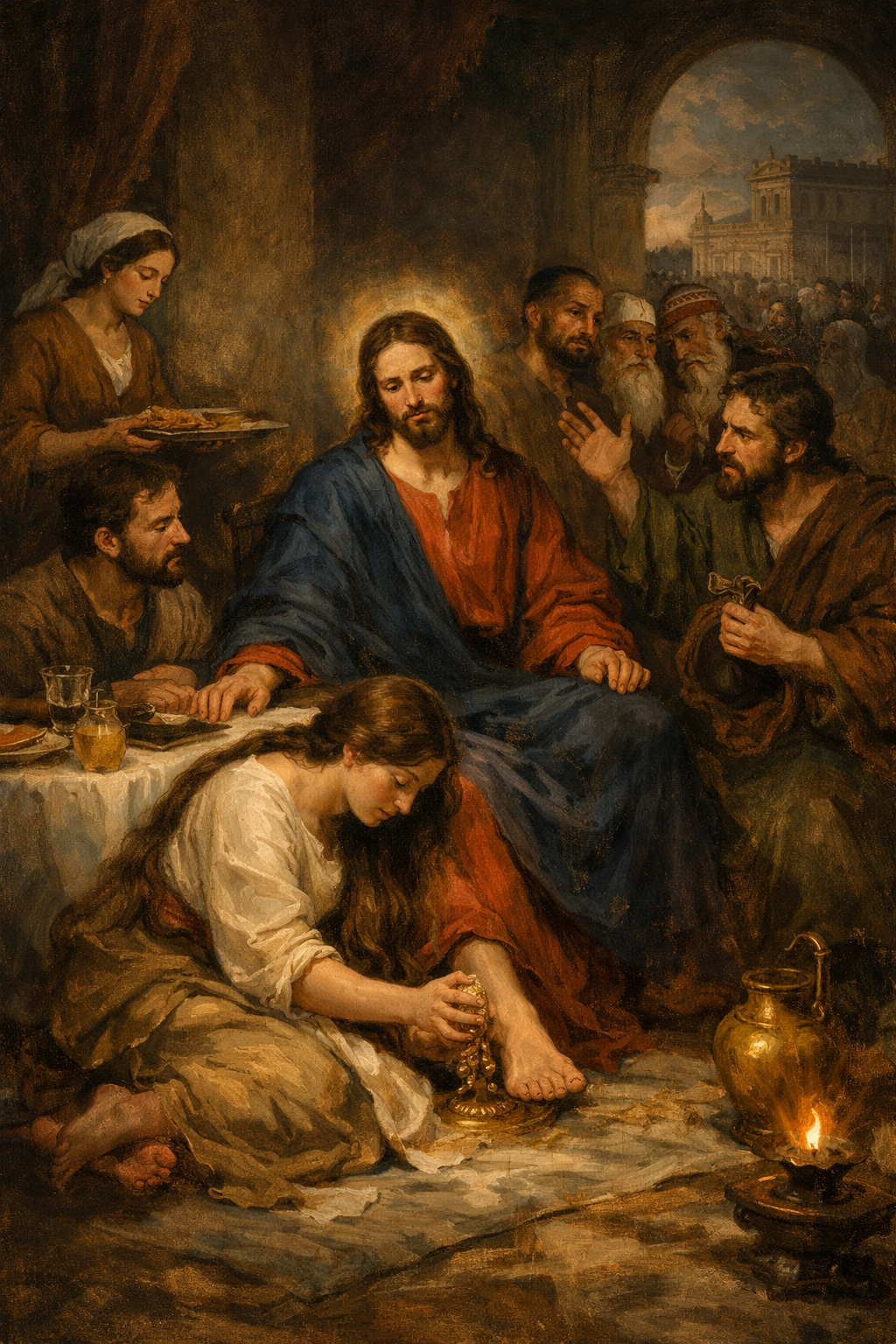마리아가 순 나르드 향유 한 리트라를 가져와서, 예수님의 발에 붓고 자기 머리카락으로 그 발을 닦아 드립니다.
