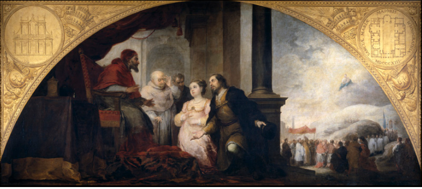 프라도에서 여러번 봤지만, 대체 무슨 이야기를 그린 것일까 늘 궁금했었습니다. 남자와 여자, 그리고 심지어 개까지 잠에 빠져 있고, 성모님께서 뭔가 말씀을 하시는 것 같은 이 그림은 스페인의 대표화가 중 한명인 바르톨로메 에스테반 무리요 [1617~1682]의 걸작 중 하나입니다. 위의 두 그림은 로마의 산타 마리아 마조레 대성전의 건립의 유래를 그리고 있습니다.